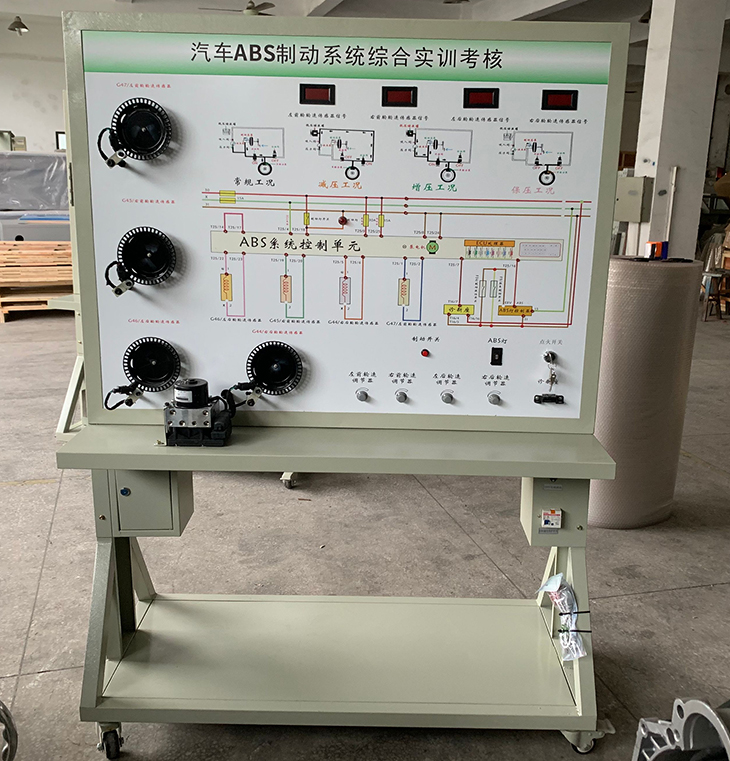 ABS控制單元、ABS電磁閥總成、輪速傳感器、制動(dòng)開(kāi)關(guān)等。檢測(cè)端子、故障設(shè)置系統(tǒng)、大容量蓄電池或12V開(kāi)關(guān)電源、大型彩色噴繪電路原理圖、控制面板、可移動(dòng)臺(tái)架、使用說(shuō)明書(shū)及任務(wù)驅(qū)動(dòng)式實(shí)訓(xùn)指導(dǎo)書(shū)等。