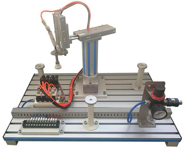 模型由回轉(zhuǎn)氣缸、雙軸氣缸、單軸氣缸、吸盤、真空發(fā)生器、電磁閥、節(jié)流閥、手滑閥、減壓閥、磁性開關(guān)、機械部件、工業(yè)鋁合金型材底板等組成,設(shè)有兩個抓取工位,可進(jìn)行工件取放控制練習(xí)。可開展對氣動機械手的操作及編程控制訓(xùn)練。配有空氣壓縮機:靜音無油,工作電源AC220V±10% 50Hz,輸入功率0.68kW;公稱容積24L,理論流量:116L/min,額定輸出氣壓0.7MPa。