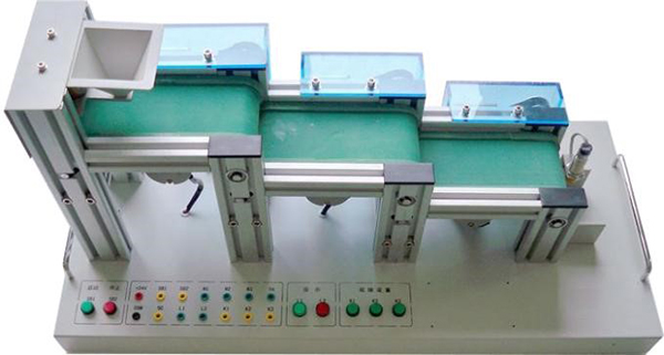 模型主要由漏斗上料裝置、三級傳送帶、直流電機、電磁鐵、電容傳感器、開關(guān)、指示燈、鋁型材框架、安裝底板、手柄等組成,通過PLC編程,可完成自動送料裝車系統(tǒng)的模擬控制。 |