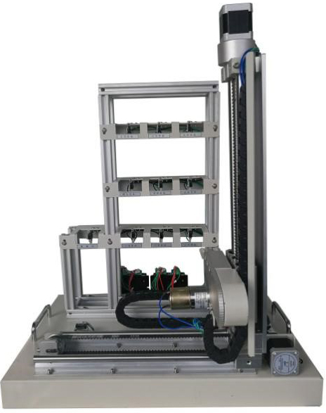 模型包含三層九倉位庫體、出/入庫倉位庫體、三維(X、Y、Z)運動機械及電氣控制等部分組成;定位執(zhí)行機構(gòu)由豎軸和橫軸組成;驅(qū)動機構(gòu)由步進(jìn)電機及步進(jìn)電機驅(qū)動器組成;傳動軸為滾珠絲桿傳動和雙軸導(dǎo)軌帶傳動,傳動平穩(wěn)。取物軸由直流減速電機驅(qū)動,可實現(xiàn)前后兩方向的運動。