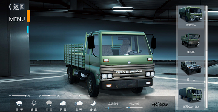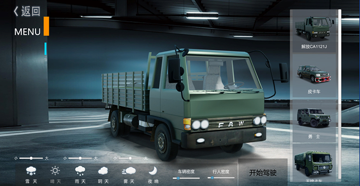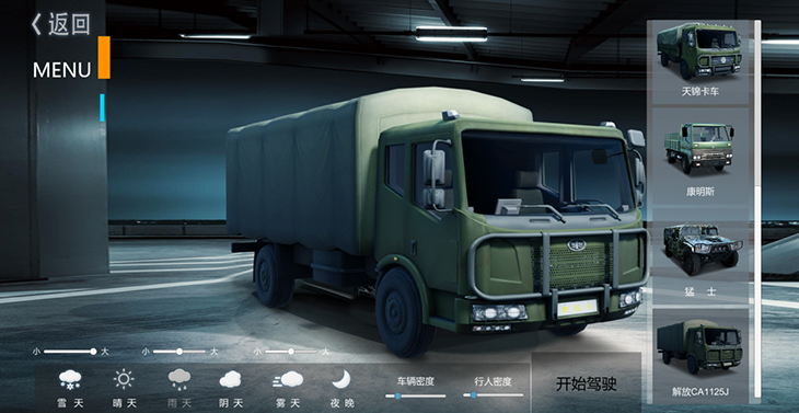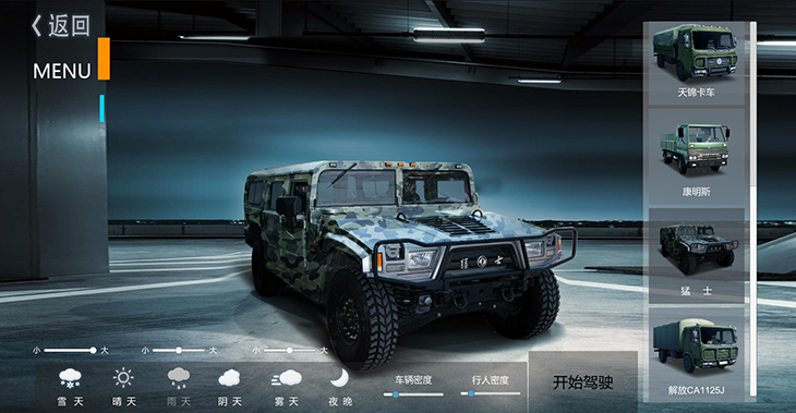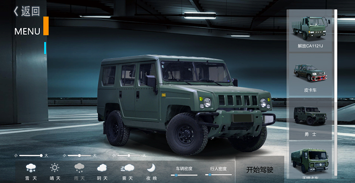 7.1、仿真車模型:10 種典型虛擬車輛模型:東風(fēng)猛士、北汽勇士、 EQ1118EQ1121、 EQ2102、SX2150、SX2190、豪濼 ZZ2197、東風(fēng)天錦、大客車等,并可根據(jù)需要拓展、定制個 性化車輛模型。