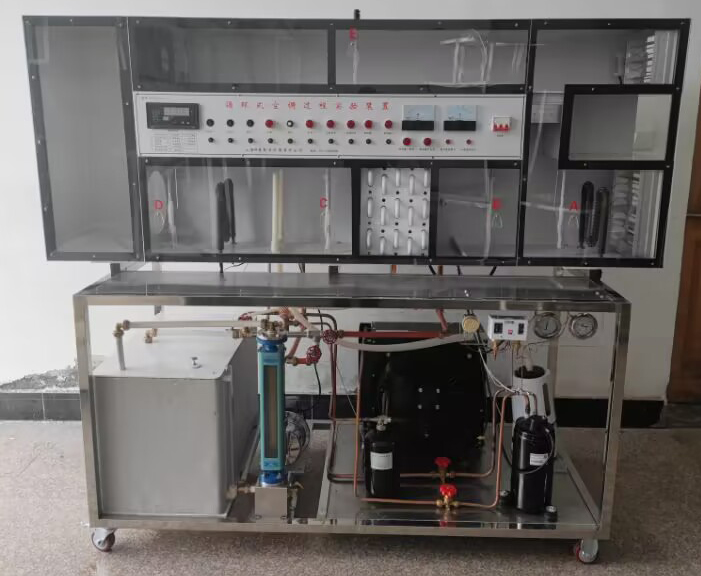 空氣熱濕處理實驗裝置為《空氣調(diào)節(jié)》課程實驗教學(xué)設(shè)備,用它可以模擬不同季節(jié)室內(nèi)和室外的環(huán)境和空氣處理調(diào)節(jié)的方法,進(jìn) 行集中式空調(diào)系統(tǒng)不同循環(huán)形式的空氣調(diào)節(jié)實驗。還可以 做變風(fēng)量運行調(diào)節(jié)實驗和制冷系統(tǒng)的參數(shù)測定及其調(diào)節(jié)實驗。裝置具有透明風(fēng)管,可直觀地觀察和測試。實驗裝置的 結(jié)構(gòu)由空氣循環(huán)系統(tǒng)、加濕器、加熱器、冷卻器及其冷水 機(jī)組和相應(yīng)的測試儀表等組成?梢詫崿F(xiàn)對空氣的加熱、冷卻、加濕和除濕(表冷式和淋水式可互換使用)等處理。 在實驗中,還可以對空氣的溫度、濕度、流量進(jìn)行測量,并 能對加溫器、加熱器的輸入電功率進(jìn)行測定,從而可以計算各空氣處理過程中的熱量和濕量得失,以及進(jìn)行熱、濕平衡 的分析。