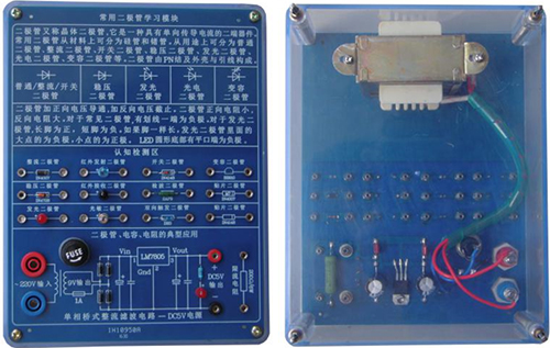 底盒使用190mm×145mm的開模有機(jī)透明塑料底盒,模塊面板采用印制電路板PCB工藝,可以直觀看到器件的實物及相關(guān)的原理介紹。對于典型應(yīng)用及易損器件安裝在面板背面,透過透明底盒能夠看到器件實物,方便感性認(rèn)識、檢測測試,同時也能防止器件的損傷。